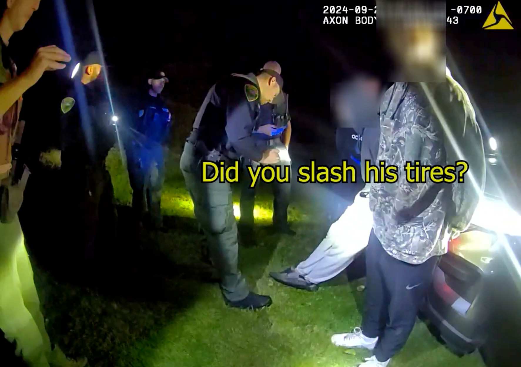 The body-cam footage resumes with Corey standing on one aspect of the highway because the 15-year-old suspect stands on the opposite aspect. The truck involves a sudden cease between them, probably to permit the 15-year-old to hop in on the correct aspect of the truck. Corey acts rapidly, pulling his knife and puncturing the truck’s left rear tire. The hissing sound of the deflating tire is audible because the truck drives away.
