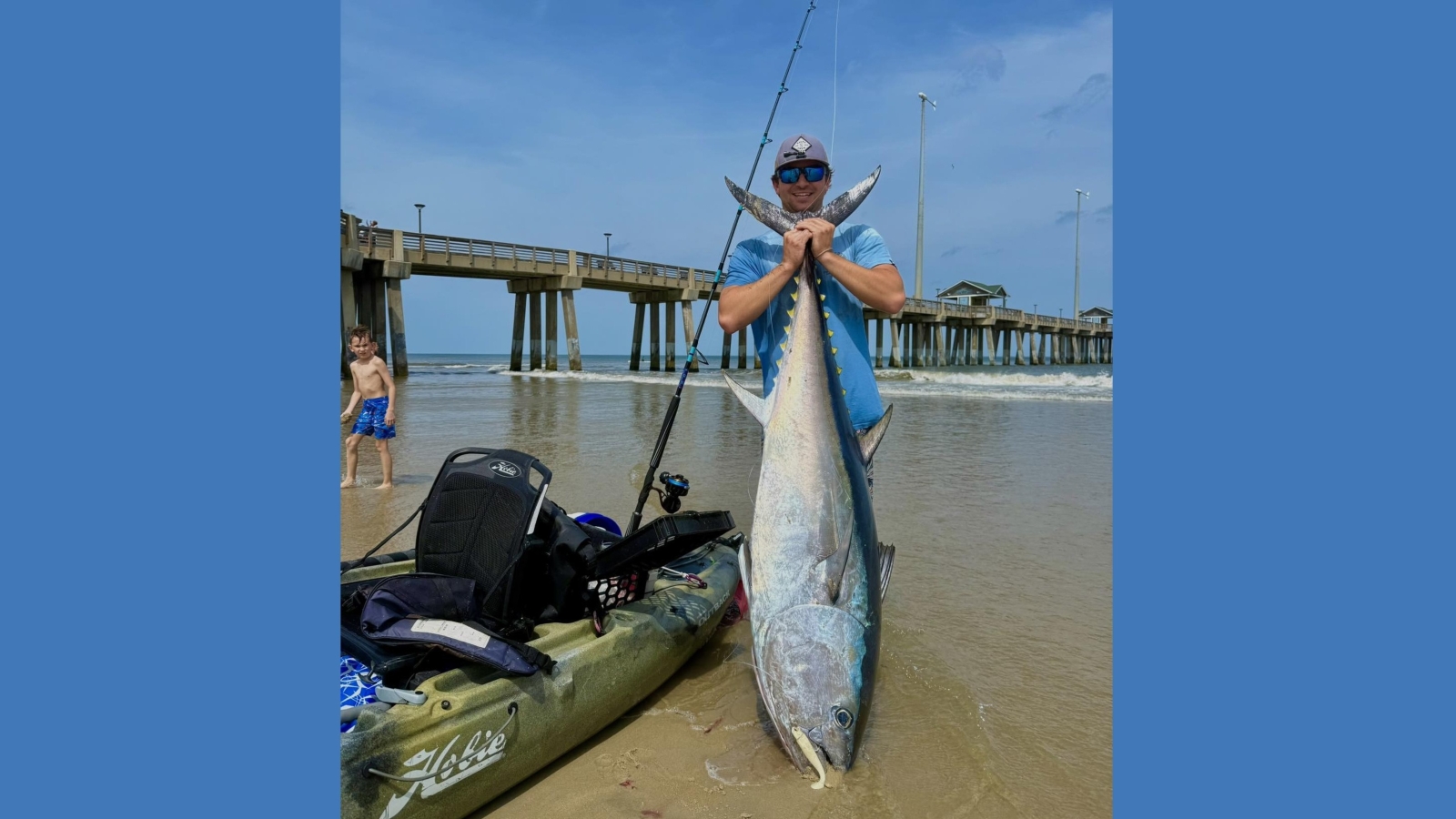 On the final day of March and the primary few days of this month, there was a historic run of nearshore bluefin tuna at Nags Head, North Carolina. Off Jennette’s Pier on the Outer Banks, a college of enormous bluefin tuna got here inside casting distance for pier anglers. Whereas Bluefin catches are nothing new within the Outer Banks, catching them proper off the seaside is just about unprecedented. A number of of those massive tuna have been connected on the pier and promptly launched pier facet, and some have been even landed proper off the pier from kayaks and boats. Stefan Turko landed a 140 lb bluefin in his kayak on April 4th, and on April fifth, Aki Min landed a 154 lb bluefin off his kayak. Then, on April seventh, one other bluefin was landed on a ship that was fishing proper off the top of the pier.