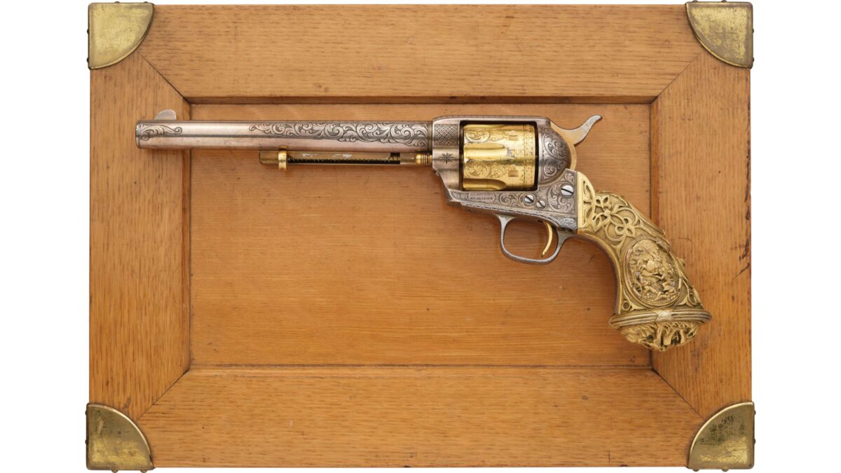 “Nimschke Engraved Colt Single Motion Military with Tiffany Grip.” Rock Island Public sale, www.rockislandauction.com/element/4096/1115/nimschke-engraved-colt-single-action-army-with-tiffany-grip. Accessed 23 Feb. 2026.