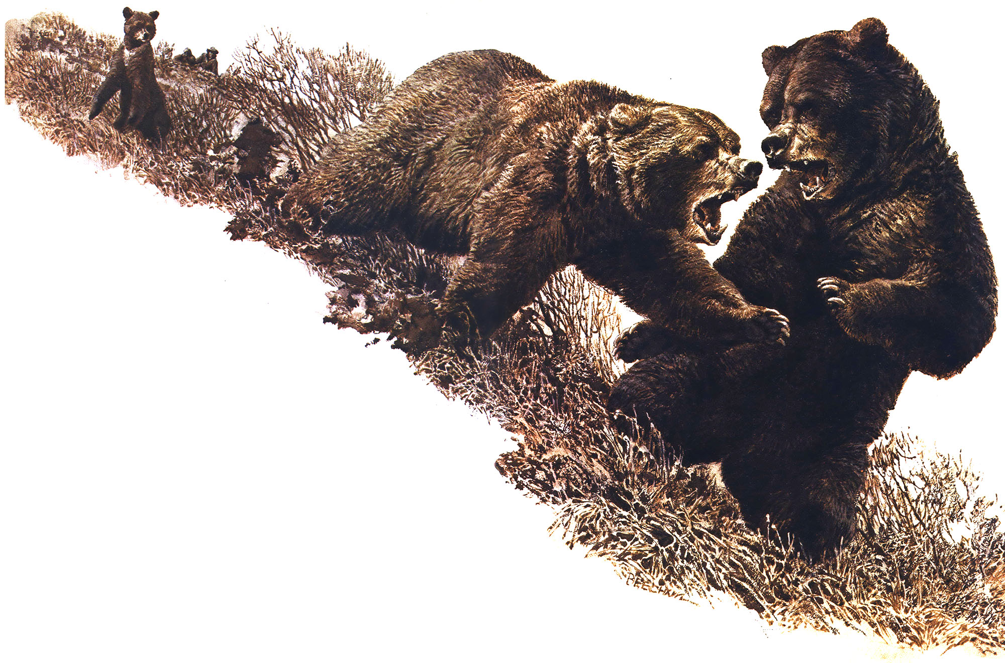 Abruptly the sow outdid herself in a roaring downhill cost on the boar. Discovering his opening, the boar leaped apart. Caught up in her personal momentum, she reeled previous the boar and tore up bushel-size chunks of moss whereas attempting desperately to wheel and head again towards her cub. The boar bolted headlong for the cub, who panicked for the highest. The massive bear virtually closed the hole in sec­onds, and the cub reversed path, hoping for security from downhill pace and the sow. For a flat second the boar paused and snapped his head round to test the sow’s progress.